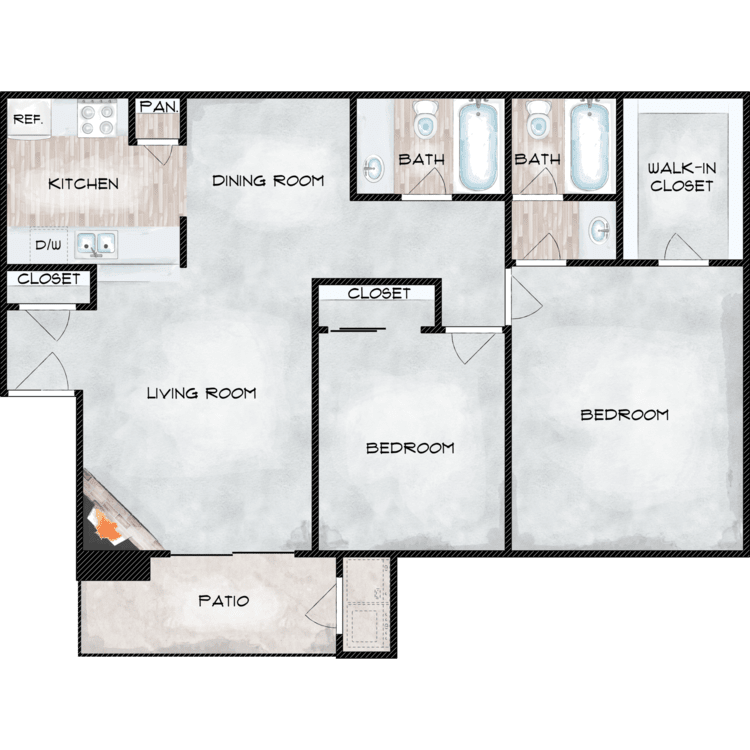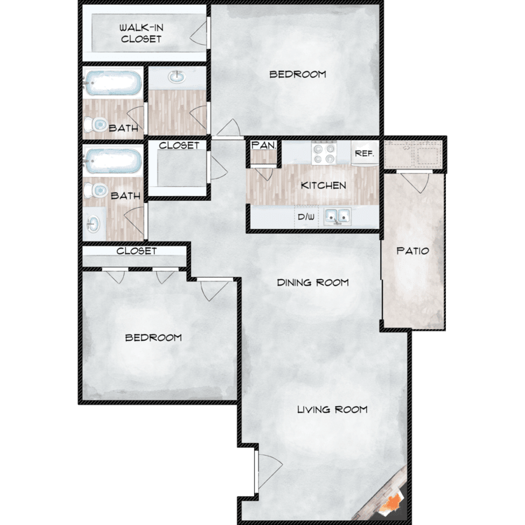 Our one and two-bedroom apartments for rent are designed to offer both style and functionality. Enjoy the benefit of air conditioning and the ease of in-home washer and dryer connections that make daily chores simple. Each home also features a modern kitchen equipped with a dishwasher and a personal balcony or patio, providing a space to relax and unwind. Thoughtful details throughout each floor plan create a home that’s both comfortable and convenient.